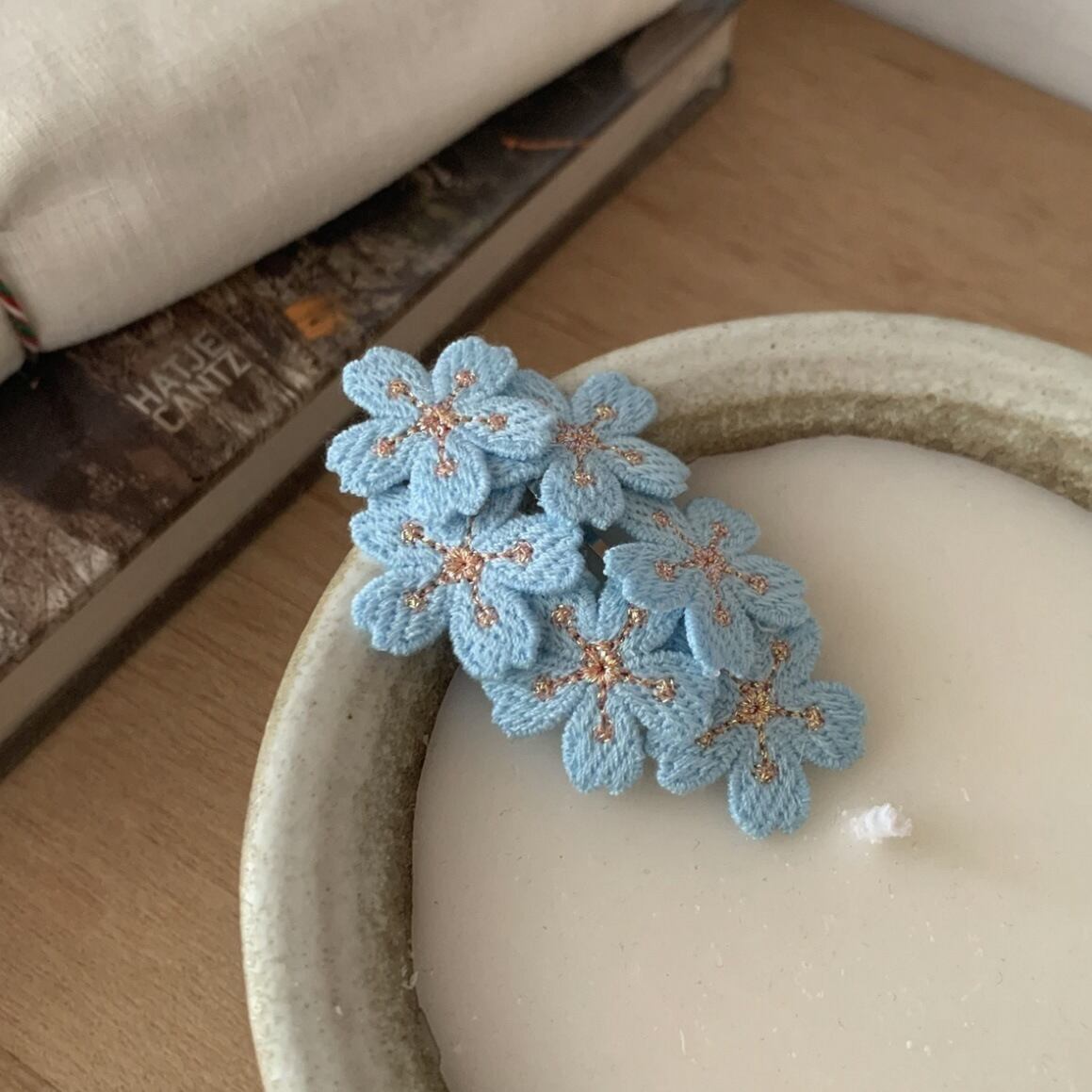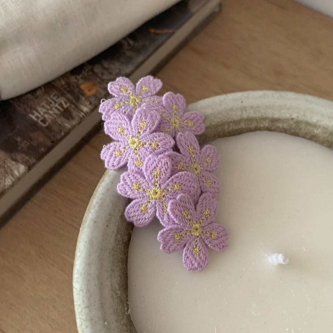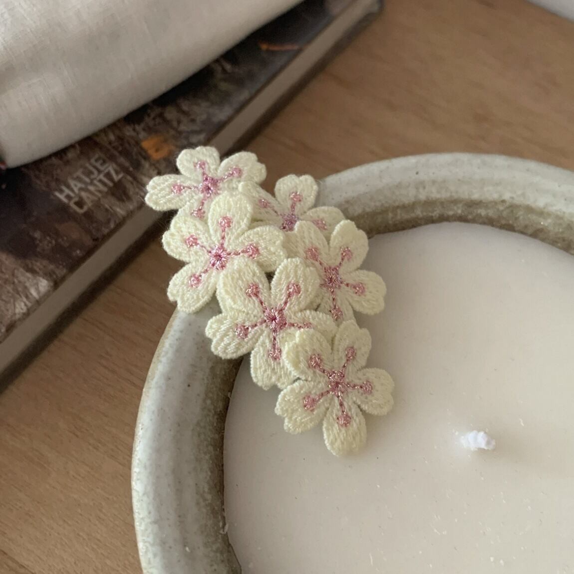 淡いピンクの桜モチーフが可愛い刺繍ヘアクリップ。