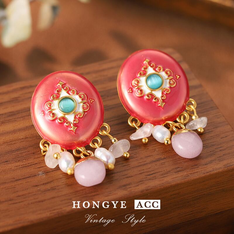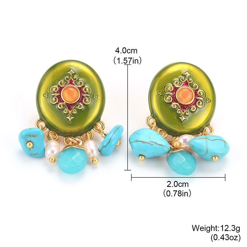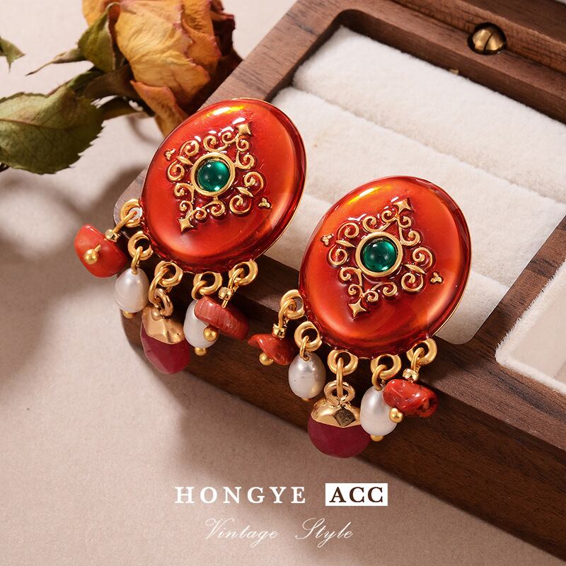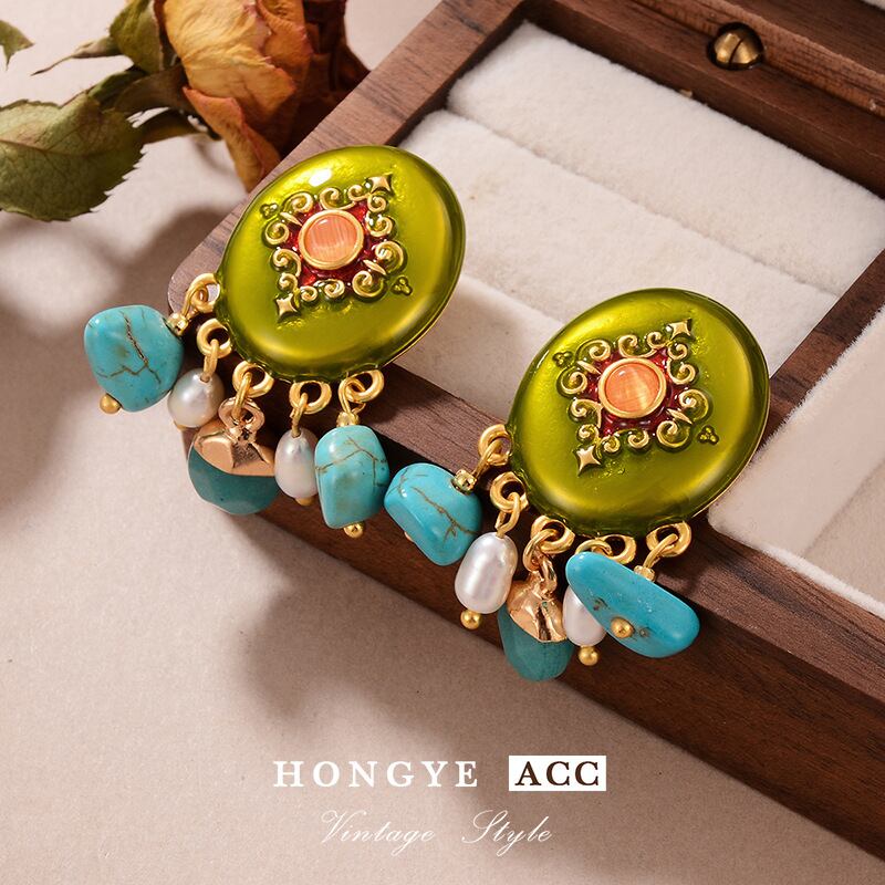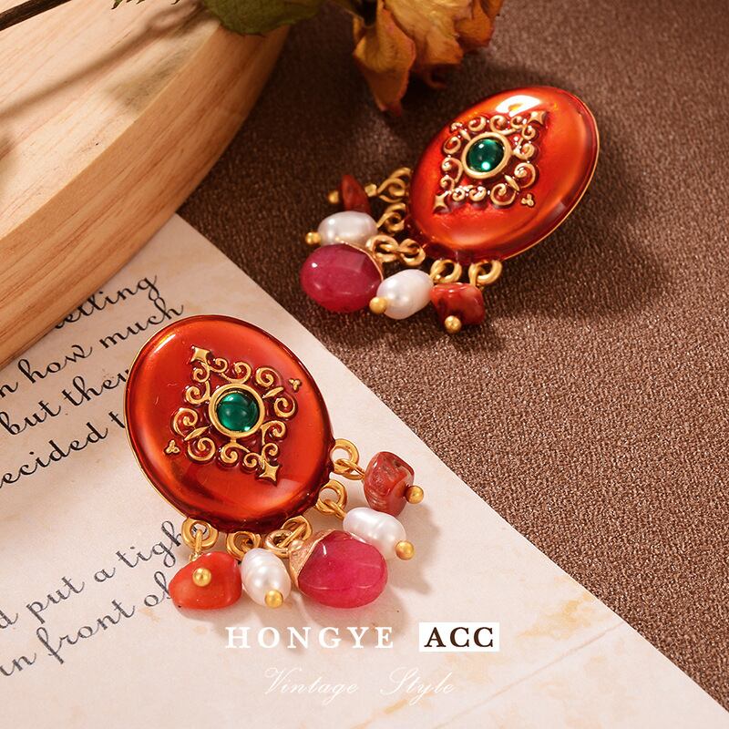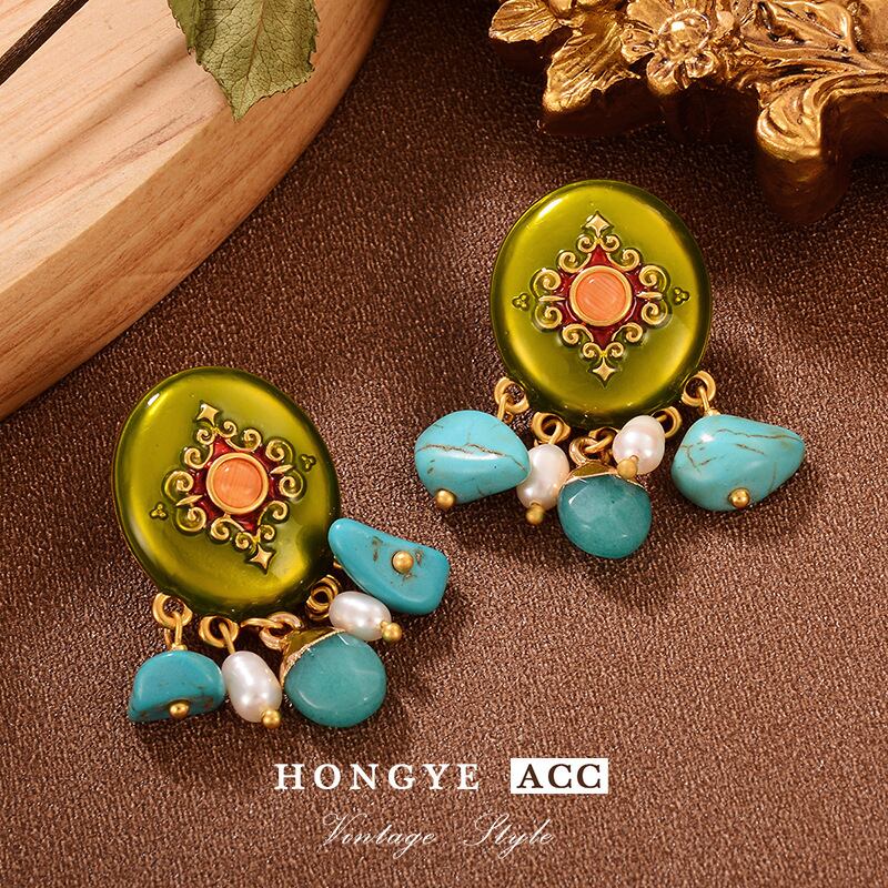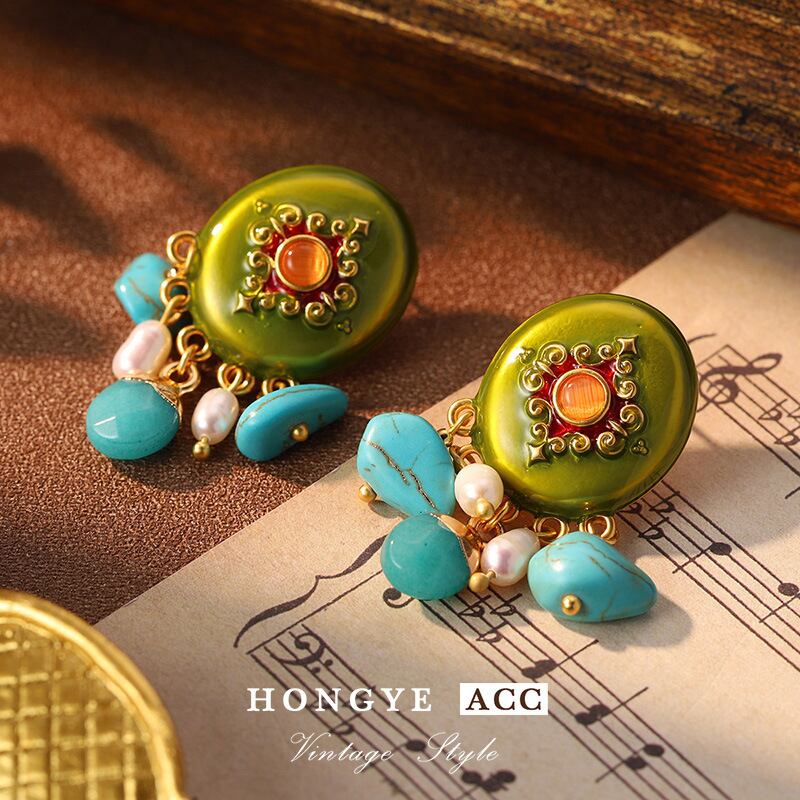 ヴィンテージ風 天然石ピアス クラシックカラーコンビデザイン 高級感アクセ YP-067