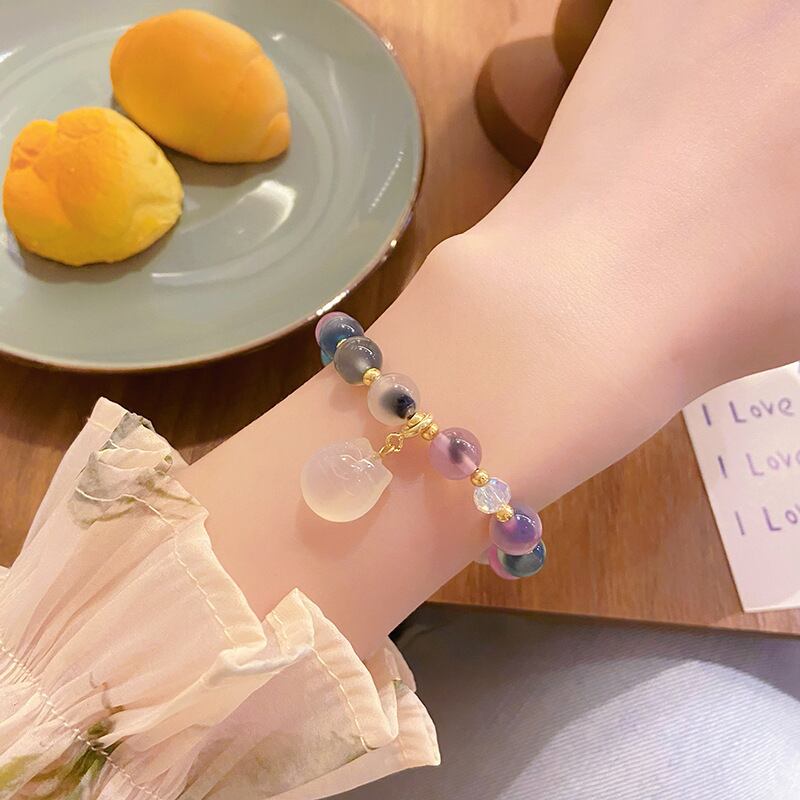 カラフルなメノウとアゲートの粒に、小さな招き猫チャームをプラスした愛らしいブレスレット。