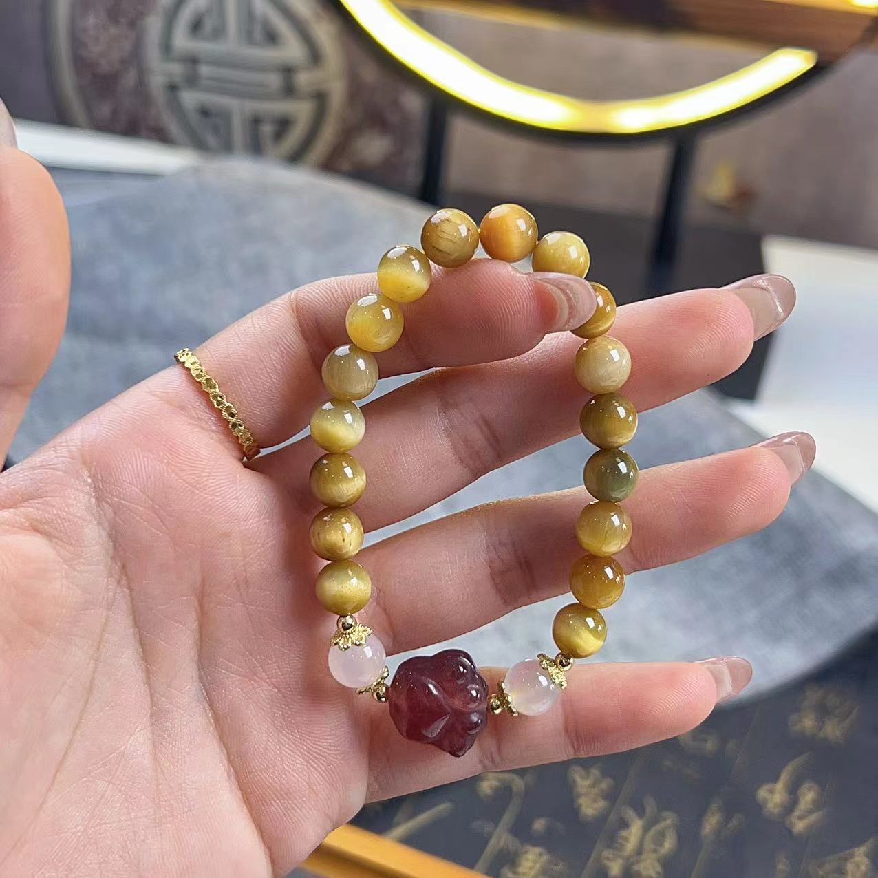 艶やかなタイガーアイと、ほんのりピンクのストロベリークォーツを組み合わせた招き猫付きブレスレット。