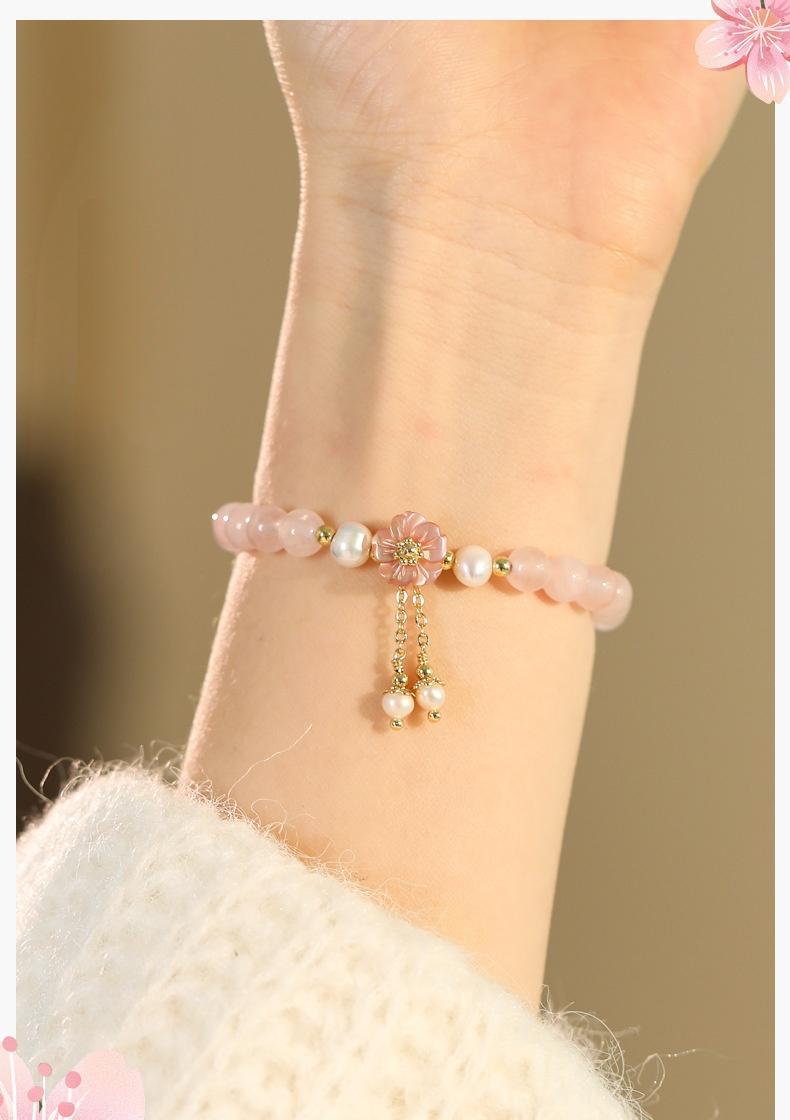 卸売対応 ピンククォーツ×パール 桃の花モチーフブレスレット TNSK0127