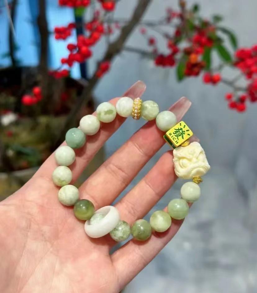 新中華風の伝統を感じさせる縁起の良い獅子モチーフに、淡いグリーンの菩提樹ビーズを組み合わせた手作りブレスレット。