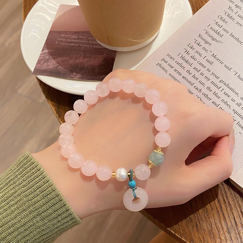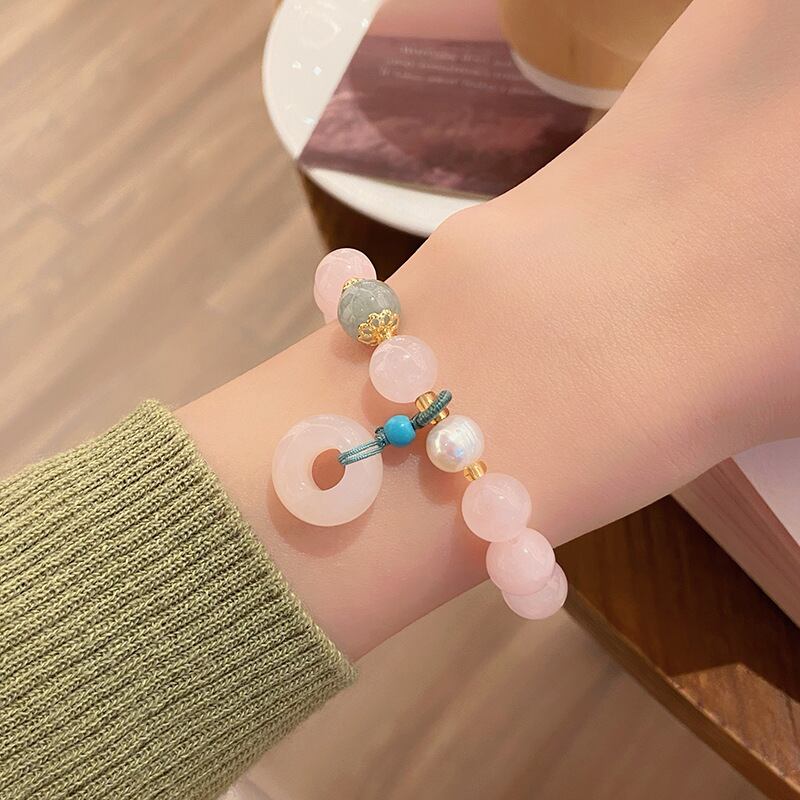 ふんわりとした優しい色合いのピンククォーツに、丸い平安型チャームを合わせたフェアリー風ブレスレット。
