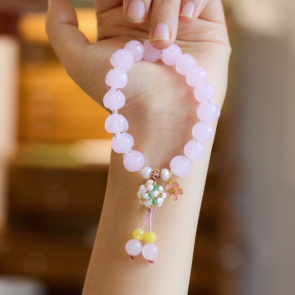 このブレスレットは精緻なピンク玉琉璃と刺繍ボールのデザインを取り入れており、ロマンチックで優しさを感じさせます。