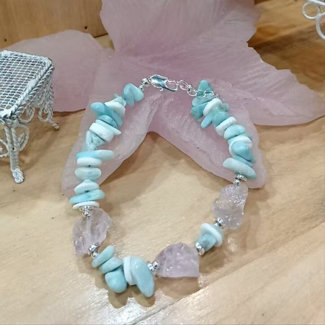 ナチュラルな天然石とクリスタルの組み合わせが涼しげ。
