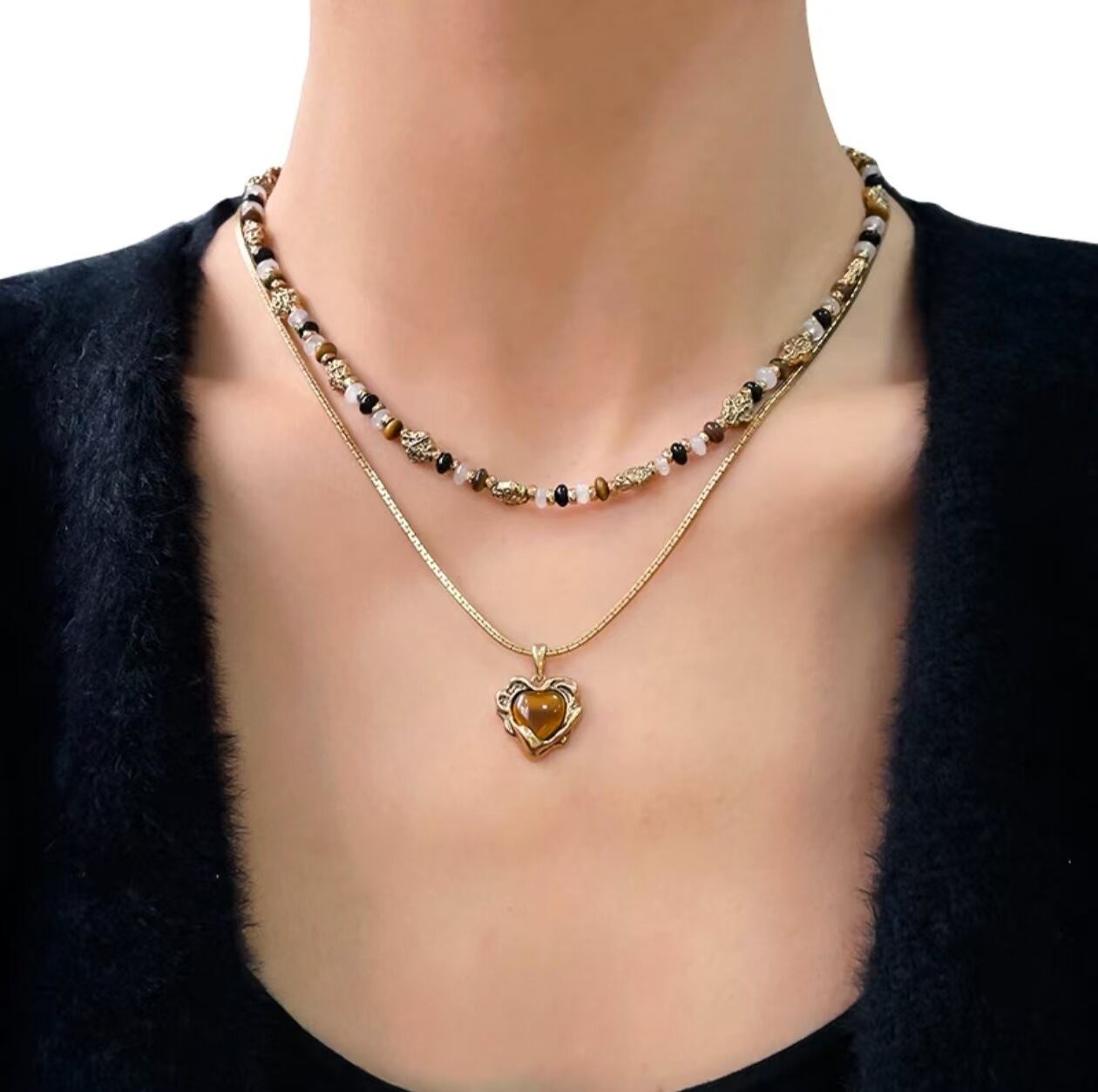 トレンドのタイガーアイとハートモチーフを取り入れた、存在感抜群のアクセサリー3点セット。