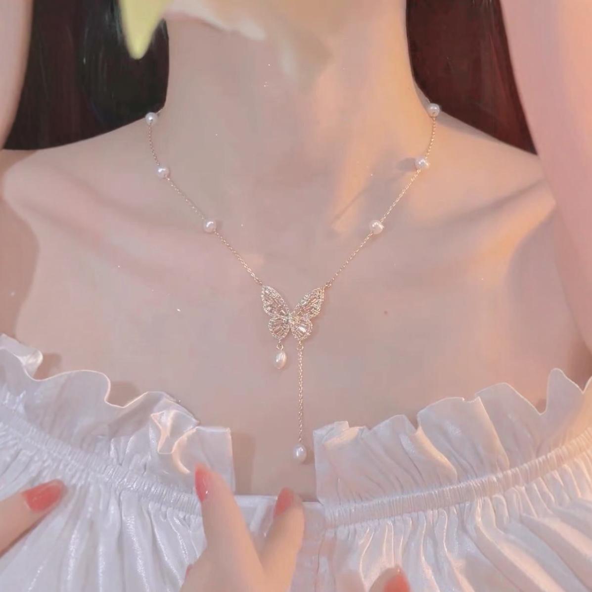 2025新作 蝶モチーフジルコニア×パール ネックレス 上品華やか鎖骨チェーン YP0194