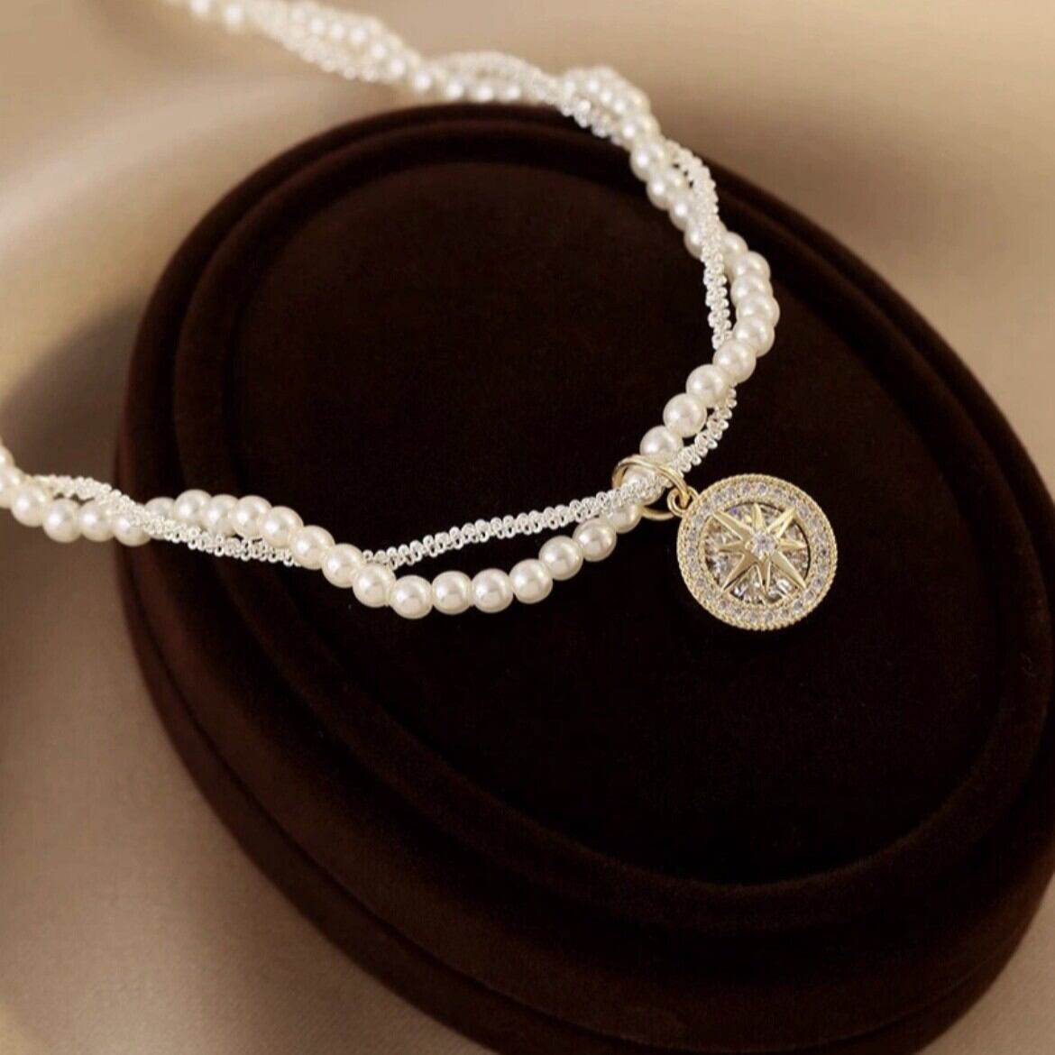 星をモチーフにしたデザインと、球状のパールが組み合わさった華やかなネックレスです。