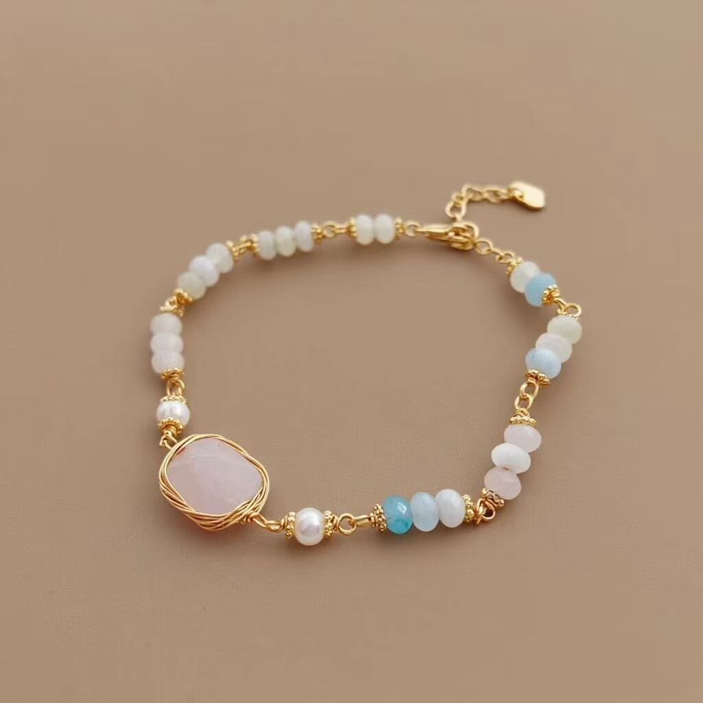 自然な形のパールが柔らかな光を放ち、ローズクォーツの淡いピンクが手元に優しいニュアンスを添えます。