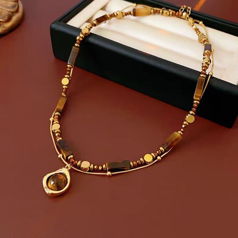光沢と虎眼石の深い色味が美しい、2点セットのデザインネックレスです。