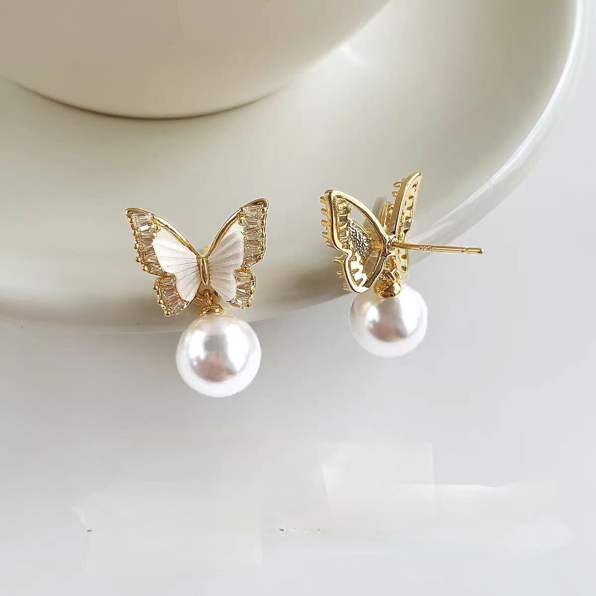繊細なゴールドの蝶モチーフにパールが揺れる、女性らしさを引き立てるイヤリングです。
