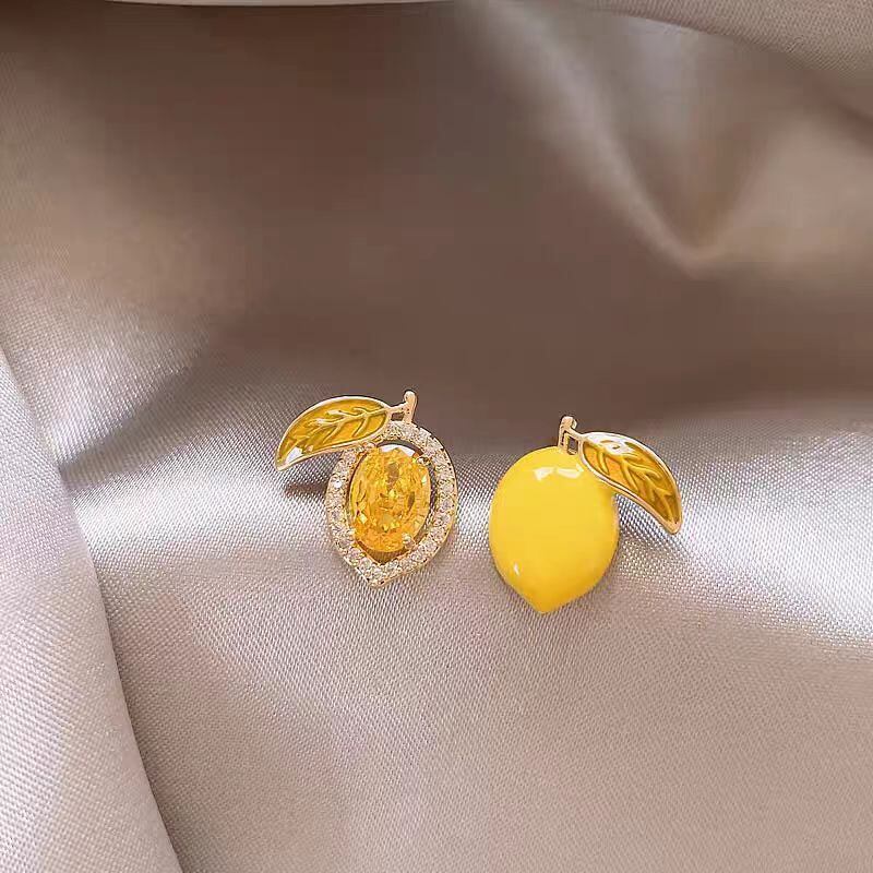 フレッシュなレモンモチーフをジルコニアで仕上げた、左右非対称の個性派ピアス。