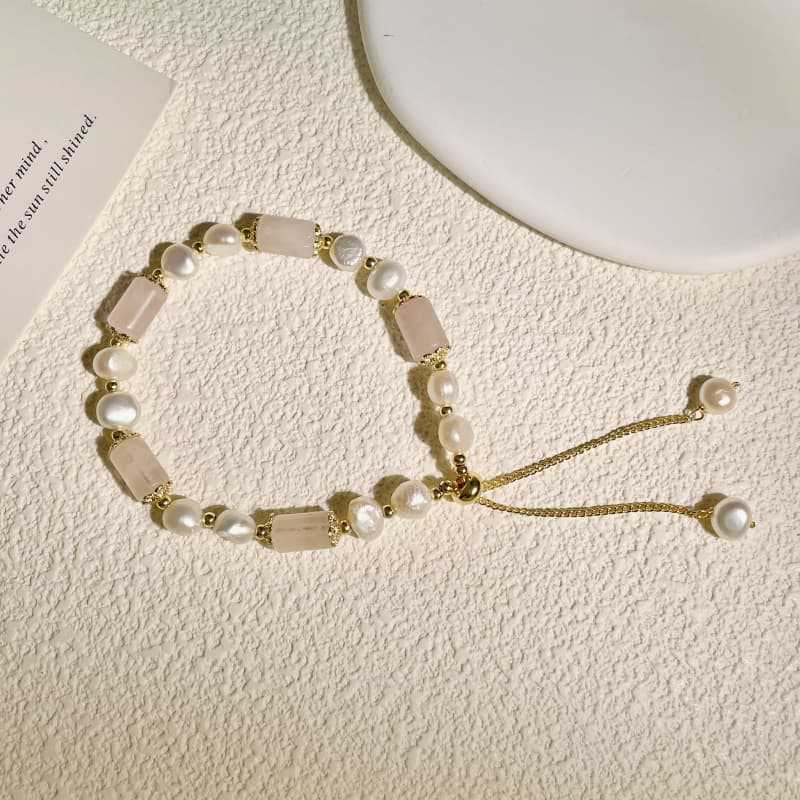 淡水パールとローズクォーツを組み合わせた、柔らかく優しい雰囲気の手作りブレスレットです。