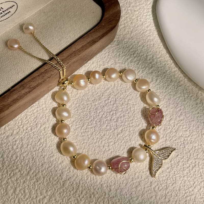 やわらかな色合いのストロベリークォーツと、存在感のあるバロックパールを組み合わせたブレスレットです。