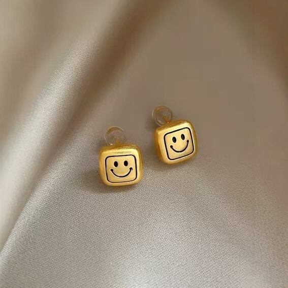 マットメタル スクエア笑顔ピアス 小众デザイン 軽奢耳飾り YP0304
