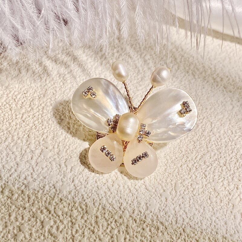 繊細な蝶モチーフに淡水パールを組み合わせた上品なブローチ。