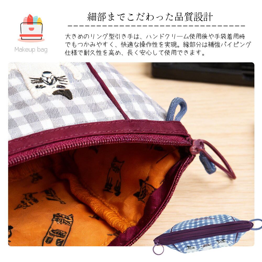 エプロンとお揃いの猫ちゃんシリーズに、使い勝手抜群のポーチが登場!細部までこだわったデザインで、バッグの中を見るたびに気分が上がります。